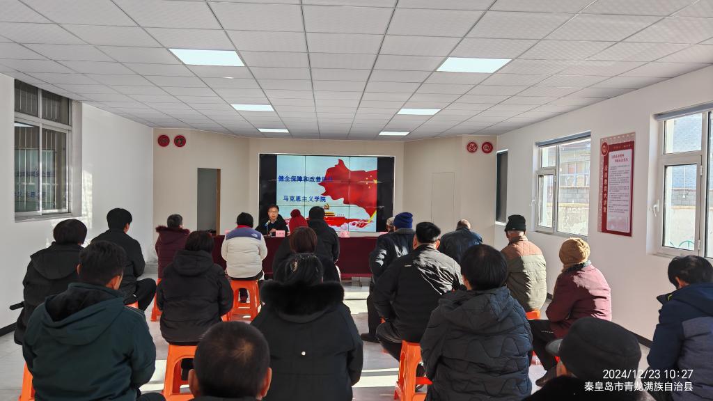 在工作队新建的党群服务中心“大讲堂”,马克思主义学院副院长王新刚针对健全保障和改善民生制度体系,结合自身亲身经历,围绕党的二十届三中全会《决定》所作出的一系列重大改革部署,包括提出完善收入分配制度、完善就业优先政策、健全社会保障体系、深化医药卫生体制改革、健全人口发展支持和服务体系等具体方面内容,为塔沟村党员同志和与会村民们上了一堂生动的党的政策宣讲课。