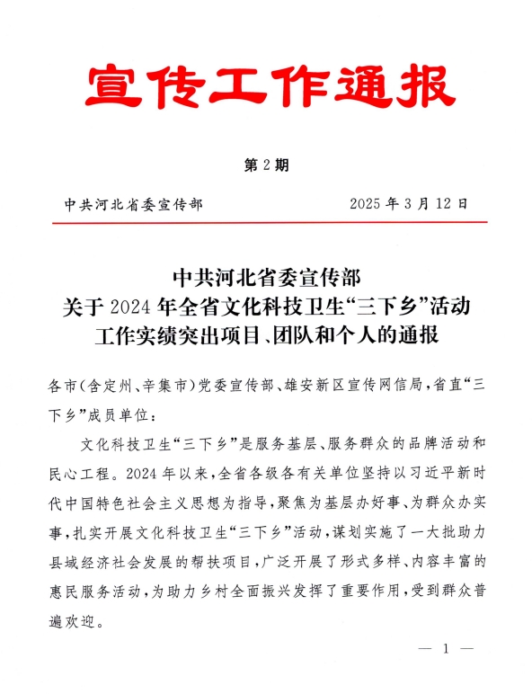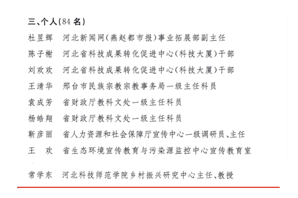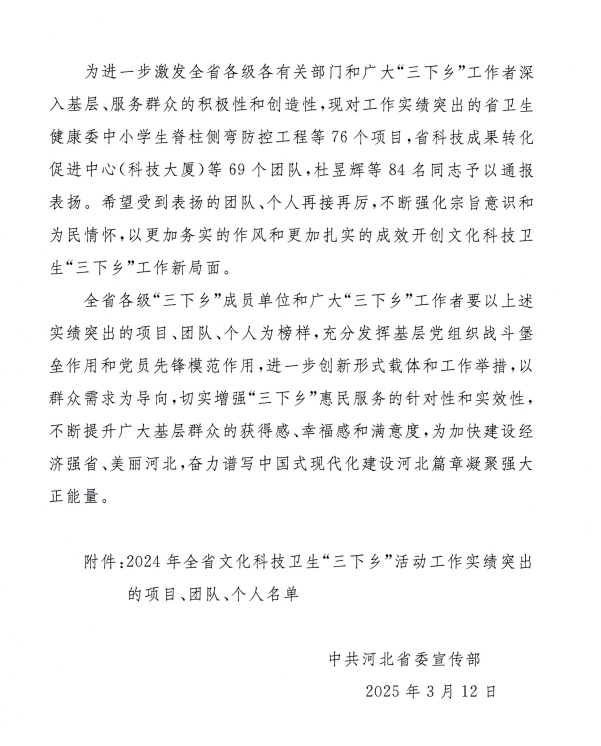 近日,中共河北省委宣传部公布《关于2024年全省文化科技卫生“三下乡”活动工作实绩突出项目、团队和个人的通报》,Beat365乡村振兴研究中心主任常学东教授获评全省文化科技卫生“三下乡”活动工作实绩突出个人。(编辑:孙艳敏 审核:王荣加)