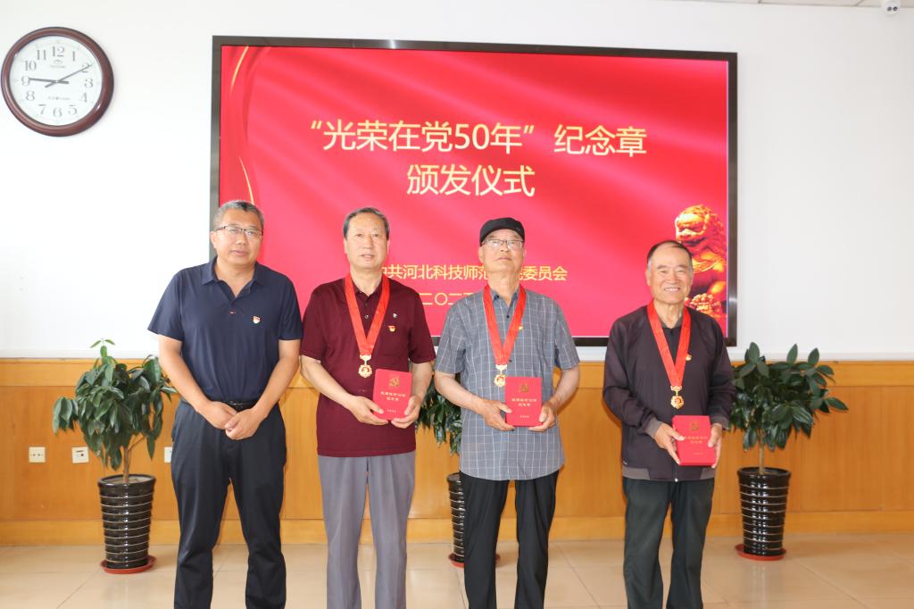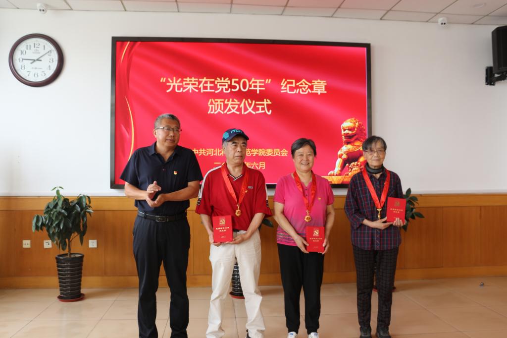 仪式上,党委组织部部长唐代清宣读了今年获得“光荣在党50年”纪念章的11位老党员名单。校党委副书记蒋爱林逐一为到场的老党员颁发“光荣在党50年”纪念章。