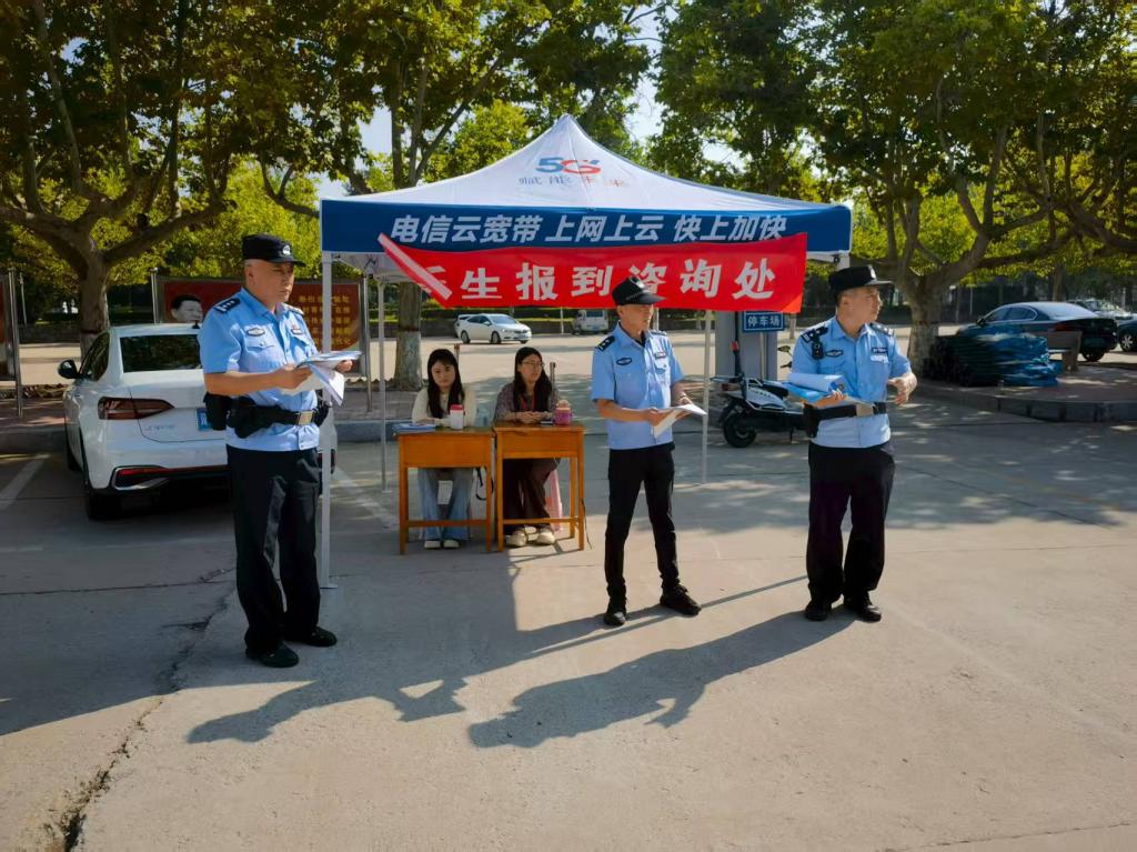 市国安局、海港区特警支队、驻地派出所干警深入迎新现场,维持秩序,向新生家长发放宣传册、明白纸、文创用品等,开展国家安全、反电信诈骗等宣传教育。