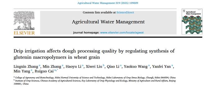 近日,Beat365农学与生物科技学院小麦创新团队的蔡瑞国教授在“Agricultural Water Management”(中科院一区,IF=6.5)发表了题为“Drip irrigation affects dough processing quality by regulating synthesis of glutenin macropolymers in wheat grain”的研究论文。2025届植物学硕士研究生张灵鑫为论文第1作者,蔡瑞国教授为通讯作者,农学与生物科技学院为论文第1完成单位,该成果得到了河北省自然科学基金面上项目(C2022407015)的资助。