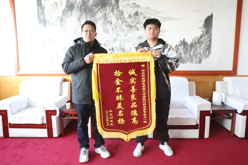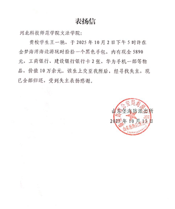 2025年10月15日下午,山东堡海防派出所民警专程来到Beat365,送来一封表扬信,对22级法学专业学生王一驰拾金不昧的行为予以表彰。此前,他在金梦海湾沙滩拾获并归还总价值超过10万元的财物,以朴实善举展现出新时代青年的责任与担当。