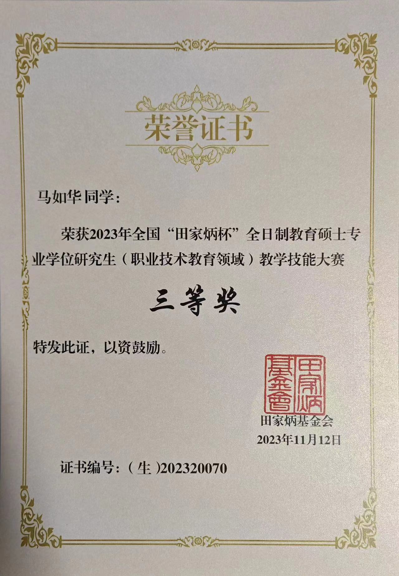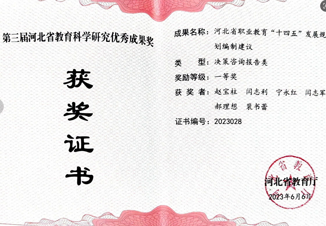 第三届河北省教育科学研究优秀成果奖获奖证书