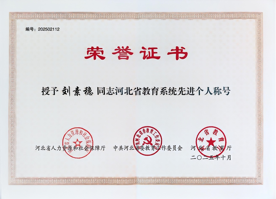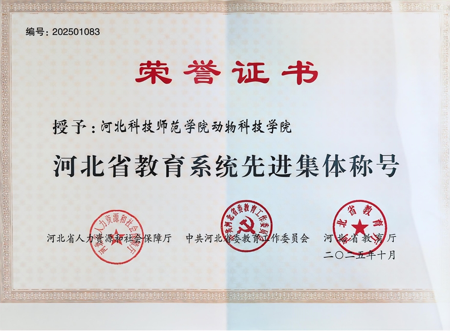 10月16日,河北省人力资源和社会保障厅、中共河北省委教育工作委员会、河北省教育厅授予动物科技学院“河北省教育系统先进集体”称号,授予刘素稳“河北省教育系统先进个人”称号。