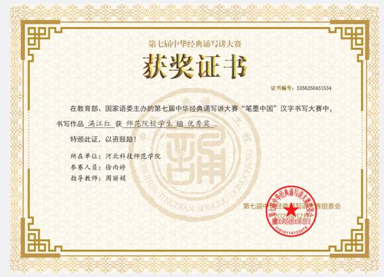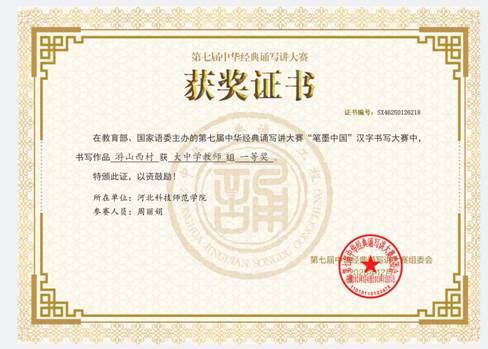 其中,周丽娟老师的粉笔字作品《游西山村》荣获大中学教师组一等奖,也是本届比赛中河北省唯一获此等级奖项的教师。徐雨婷、余青烨两位同学分获大学生组粉笔字与硬笔字优秀奖。