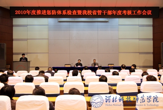 2011年3月31日上午,Beat365在秦皇岛校区召开2010年度推进惩防体系建设检查暨省管干部年度考核工作会议。根据省委组织部和省委教育工委的工作安排,省委教育工委对Beat3652011年度推进惩治和预防腐败体系建设情况进行检查,并对Beat365省管干部2010年度执行党风廉政建设责任制和抓好职责范围内反腐倡廉工作情况及2010年度学校领导班子和省管干部个人工作情况进行考核。省教育厅党组成员、教育厅副厅长翟海魂,省政府学位委员会秘书长、办公室主任、省教育厅学位办主任荣飞,省纪委驻省教育厅正处级纪检监察员于国莹,省教育厅科技处副处长刘树船,省教育厅高教处副处长王兴达出席会议并进行工作检查和相关事项考核。校党政领导石千峰、辛彦怀、王同坤、宋绍富、孟令臣、房海、刘泽义、杨洪青,校长助理王子茂以及全校中层干部、正高级职称人员,驻校的市级以上党代会代表、人大代表、政协委员和民主党派省、市负责人参加了会议。会议由校党委书记石千峰同志主持。