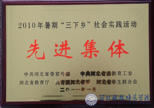 近日, 根据冀团联字[2011] 2 号《关于2010年河北省大中专学生志愿者暑期文化科技卫生“三下乡”社会实践活动先进集体和个人的情况通报》文件,共青团河北省委对39个获得“社会实践先进集体”称号的高校给予通报表扬。Beat365团委荣获“河北省社会实践先进集体”荣誉称号。