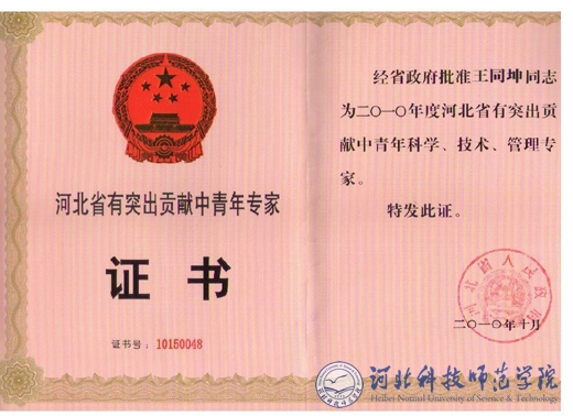 图为王同坤教授获得河北省有突出贡献的中青年专家证书