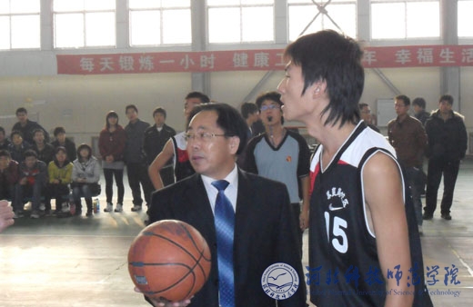 图为副校长孟令臣为篮球赛开球