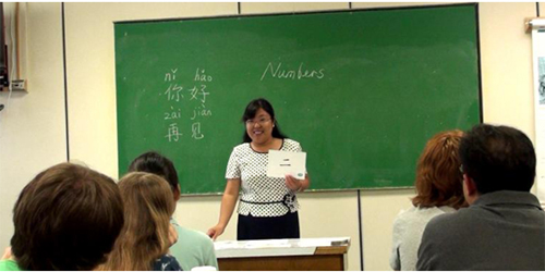 图为范学荣老师在给外国学生上汉语课
