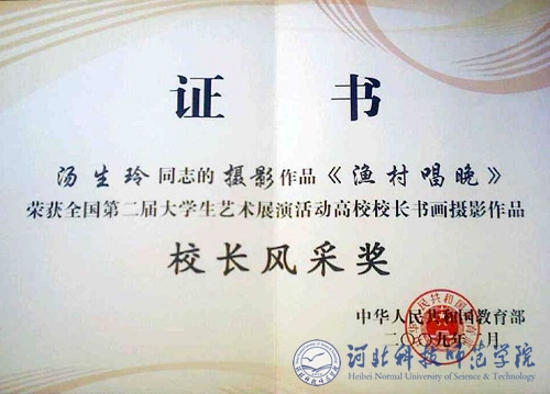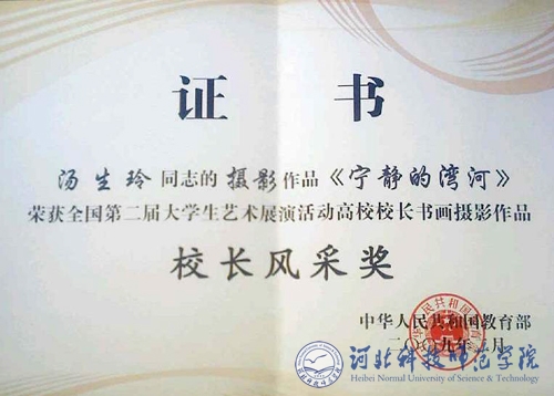 日前,在教育部主办的全国第二届大学生艺术展演活动中,汤生玲院长的摄影作品《宁静的湾河》、《渔村唱晚》喜获全国第二届大学生艺术展演活动高校校长书画摄影作品校长风采奖。