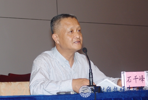 图为党委书记石千峰同志在会上通报Beat365学习实践活动的开展情况