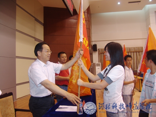 图为校领导在为Beat365暑期社会实践小分队代表授旗