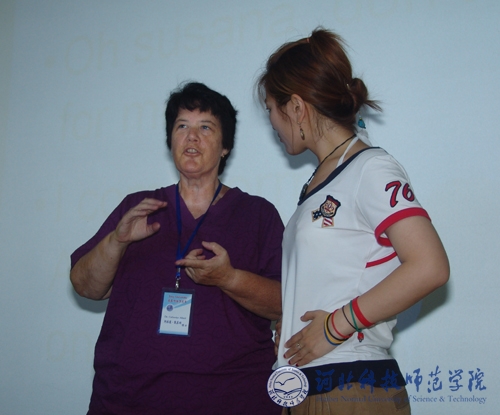 图为来访教师美国特洛伊大学博士阿拉德.凯瑟琳(Dr. Catherine Allard)在给艺术学院学生上课