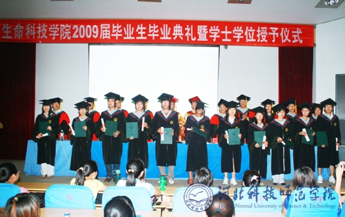 2009年6月28日下午,生命科技学院在昌黎校区学术报告厅举行了2009届毕业生毕业典礼暨学位授予仪式。校党委书记石千峰,院长汤生玲,副院长王同坤,副院长孟令臣出席典礼。昌黎校区办主任刘卫东,研究生部主任张立彬,校学工部副部长、团委书记李艳坡,生命科技学院党委书记李彦生,院长东方阳,生命科技学院党委副书记、副院长孟庆东,副院长乔亚科,副院长杨晓玲及毕业班班主任、270名全体毕业生和部分在校生代表参加了典礼。典礼由孟庆东主持。