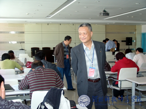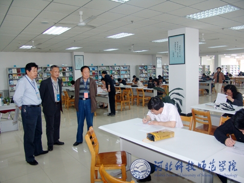 图为校领导石千峰、陈继生和组织部长高书国在图书馆三楼考场巡视