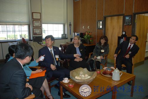 图为汤生玲院长与特洛伊大学校方代表洽谈深入合作事宜