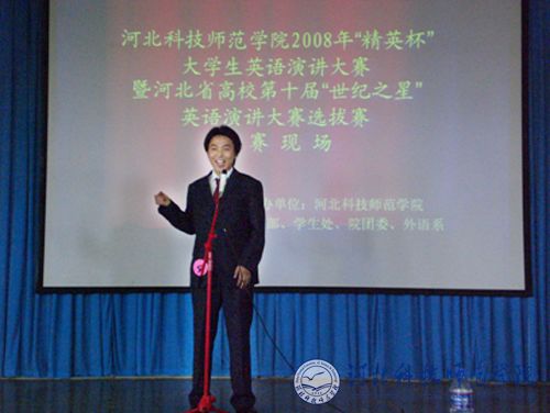 2008年6月26日下午,Beat3652008年“精英杯”大学生英语演讲大赛暨河北省高校第十届“世纪之星”英语演讲大赛选拔赛决赛在开发区校区学术报告厅举行。活动由党委学工部、学生处、团委、外语系共同主办。外语系副主任邵丽君、副主任游建民和各教研室主任和Shana等六名外籍教师担任决赛评委,近五百名师生观看了比赛。