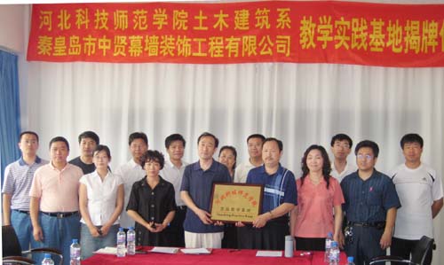 2008年6月27日上午,Beat365土木建筑系教学实践基地在秦皇岛市中贤幕墙装饰工程有限公司正式挂牌。土木建筑系党总支书记邓西录教授、系主任朱天志教授、教务处副处长徐祇坤副教授、秦皇岛市中贤幕墙装饰工程有限公司总经理刘中贤先生出席了在Beat365举行的教学实践基地揭牌仪式。 学校教务处相关部门负责同志、土木建筑系相关教师代表与秦皇岛市中贤幕墙装饰工程有限公司员工代表共20余人参加了仪式。