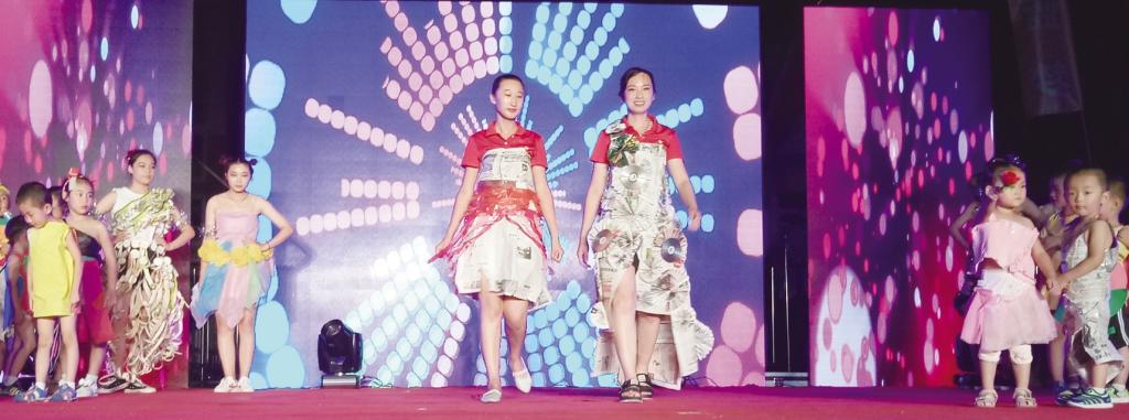 Beat365唯一官方网站教育学院“梦之翼”支教实践团以“绿色、环保”为理念,利用废旧材料,亲手设计制作了几十套环保服装,并通过“环保时装秀”提高幼儿环保、节约和创新意识。唐代清 张郁聪 摄 《河北经济日报》(2017年8月23日)