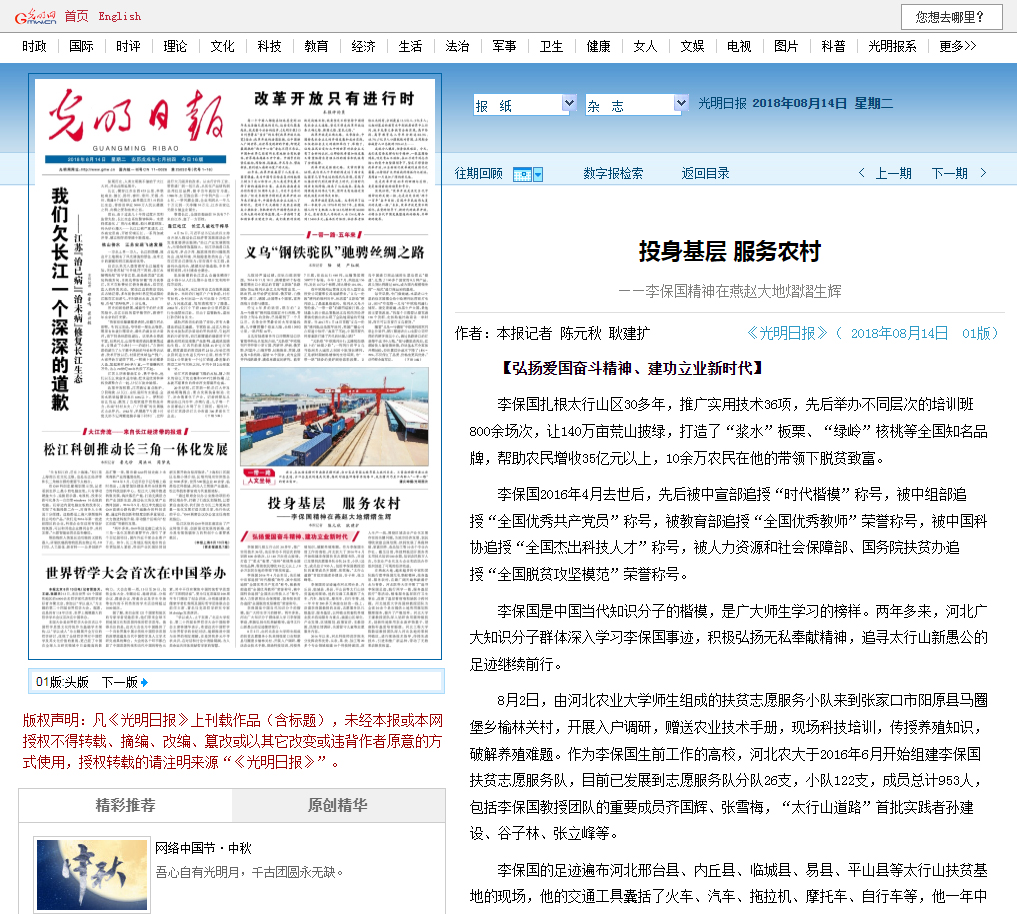 2018年8月14日《光明日报》第一版报道
