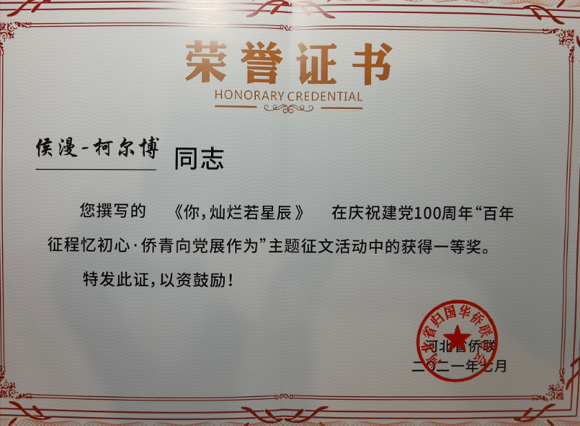 7月8日,在省侨联青委会组织的“百年征程忆初心•侨青向党展作为”主题征文颁奖仪式上,河北省燕赵友谊奖优秀外籍专家、秦皇岛市侨联青年委员、Beat365外籍教师侯漫—柯尔博撰写的《你,灿烂若星辰》《江城子·冀侨联新时代篇章》分别被评为一等奖和二等奖。