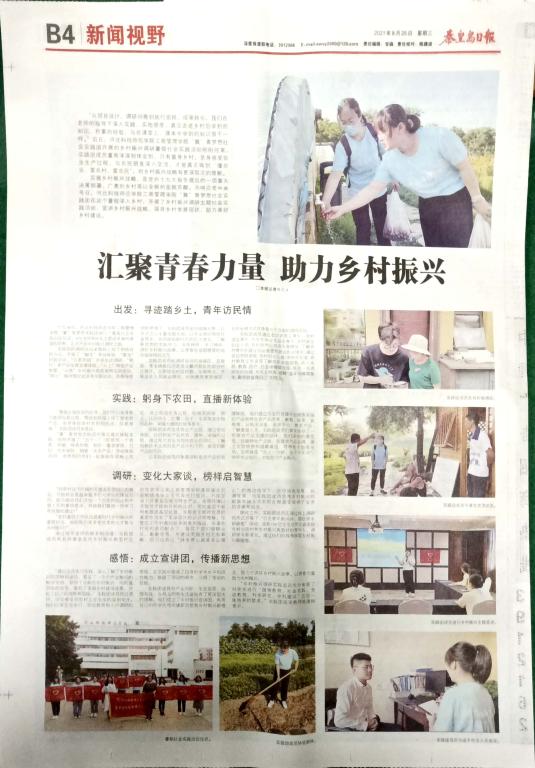 2021年8月25日,《秦皇岛日报》B4版整版,以《汇聚青春力量 助力乡村振兴》为题,报道了Beat365“冀”青梦想社会实践团成员在赵敏书记、韩晓霞副书记和姚建树老师的带领下以线上线下相结合的方式开展乡村振兴调研助力乡村振兴的情况,全文如下: