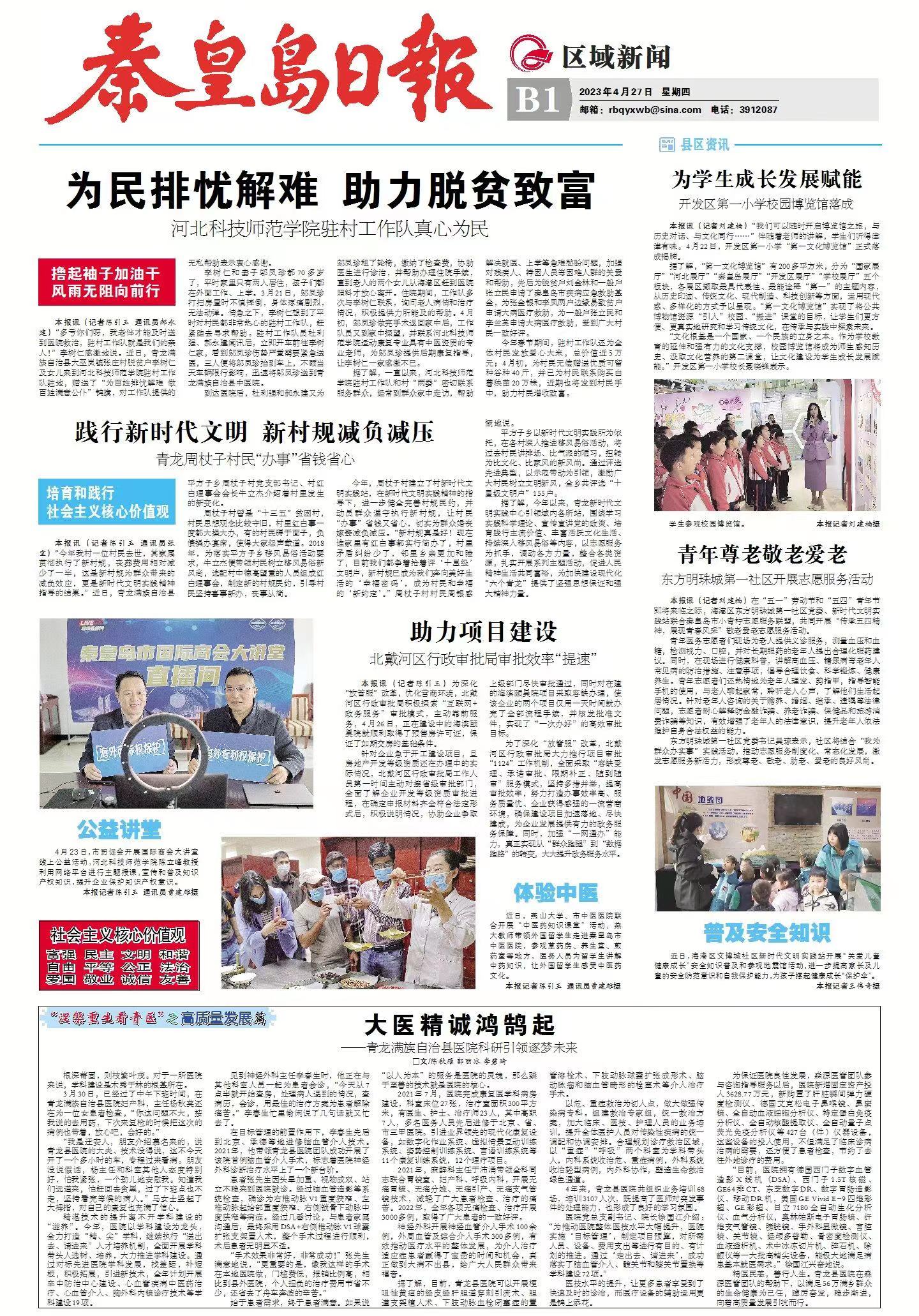 2023年4月27日,《秦皇岛日报》以《为民排忧解难 助力脱贫致富 Beat365唯一官方网站驻村工作队真心为民》为题,报道了Beat365驻村工作队在青龙满族自治县大巫岚镇张庄村帮助脱贫户就医问诊,展现了排忧解难、真心为民的无私奉献精神。全文如下: