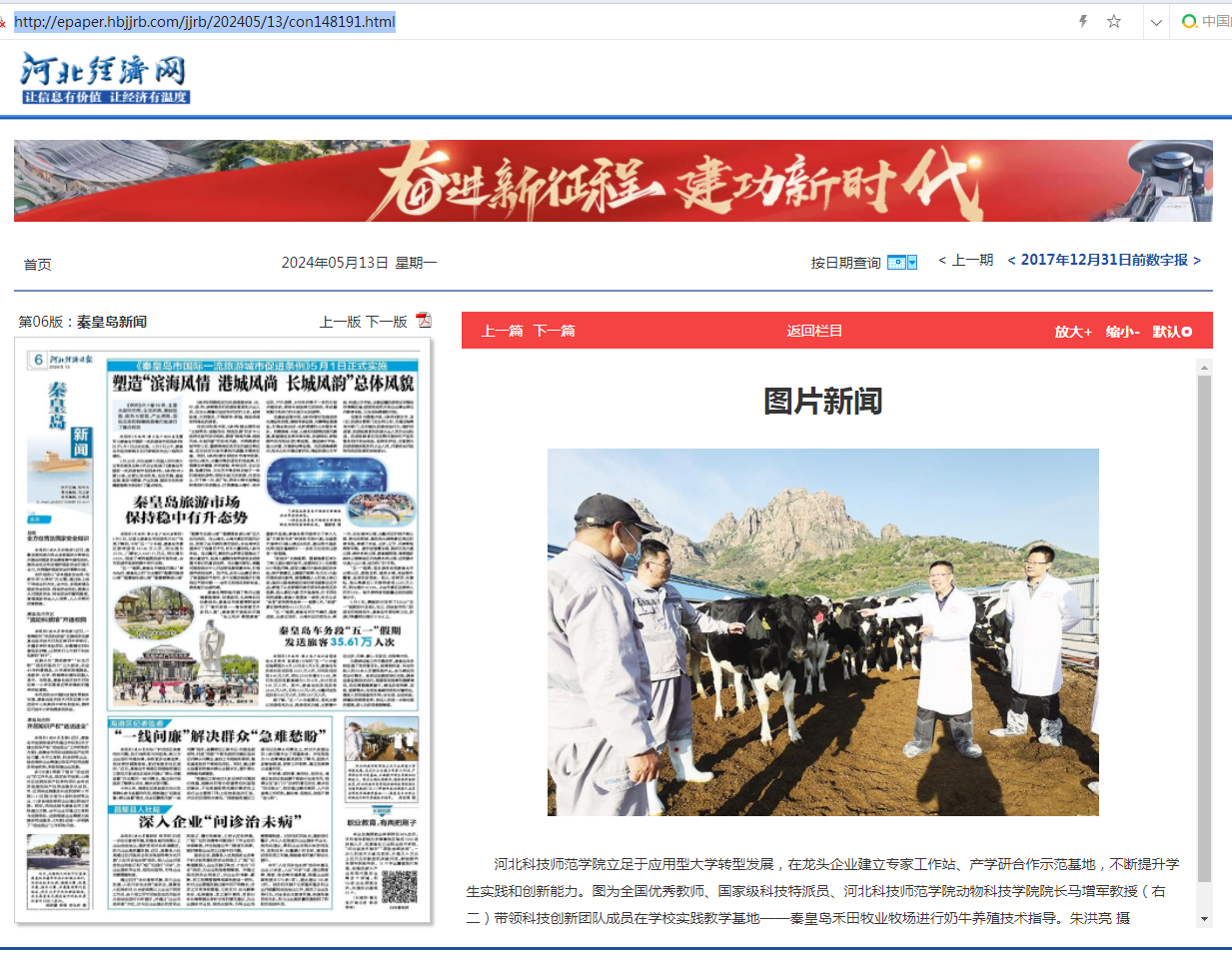 2023年5月13日《河北经济日报》数字报以图片新闻形式报道Beat365全国优秀教师、国家级科技特派员、动物科技学院院长马增军教授带领科技创新团队成员在学校实践教学基地——秦皇岛禾田牧业牧场进行奶牛养殖技术指导情况。(编辑:孙艳敏  审核:朱洪亮)