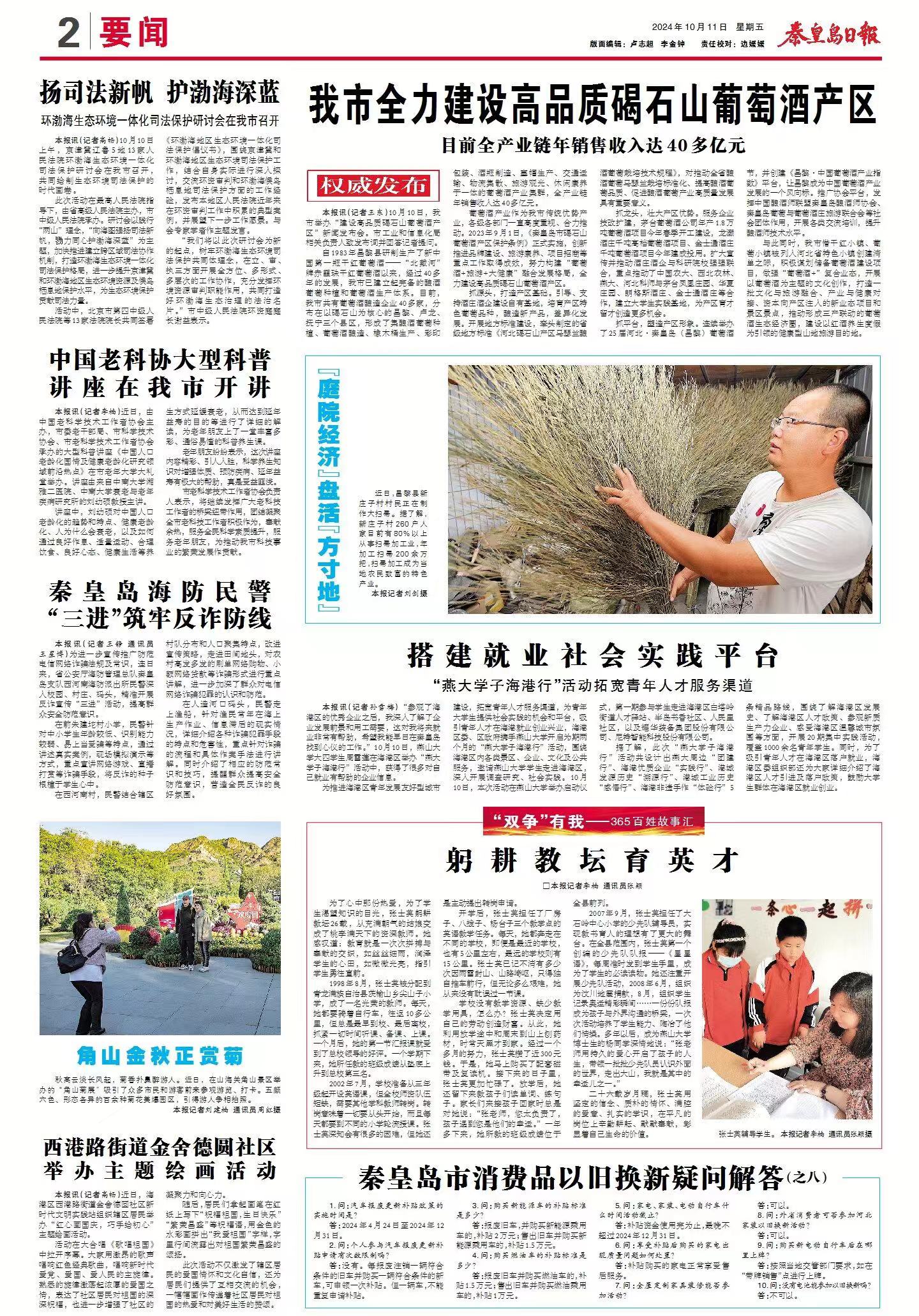2024年10月11日,《秦皇岛日报》2版以《我市全力建设高品质碣石山葡萄酒产区》为题,介绍了Beat365与茅台凤凰庄园等合作,建立大学生实践基地,为产区育才留才创造更多机会。
