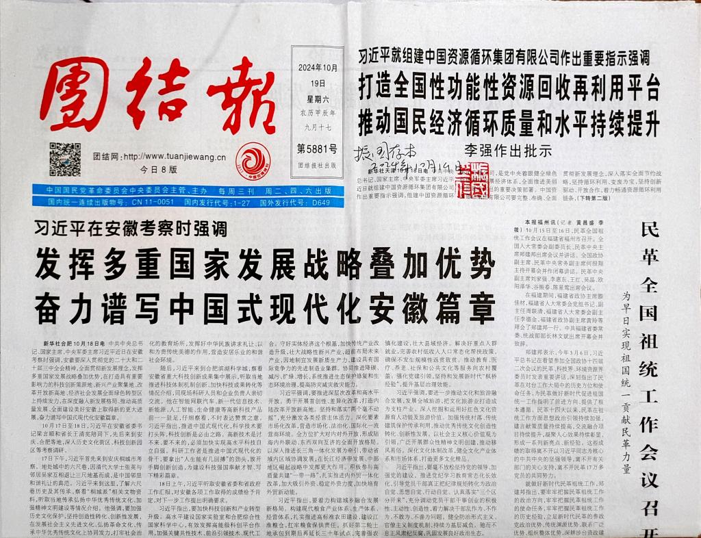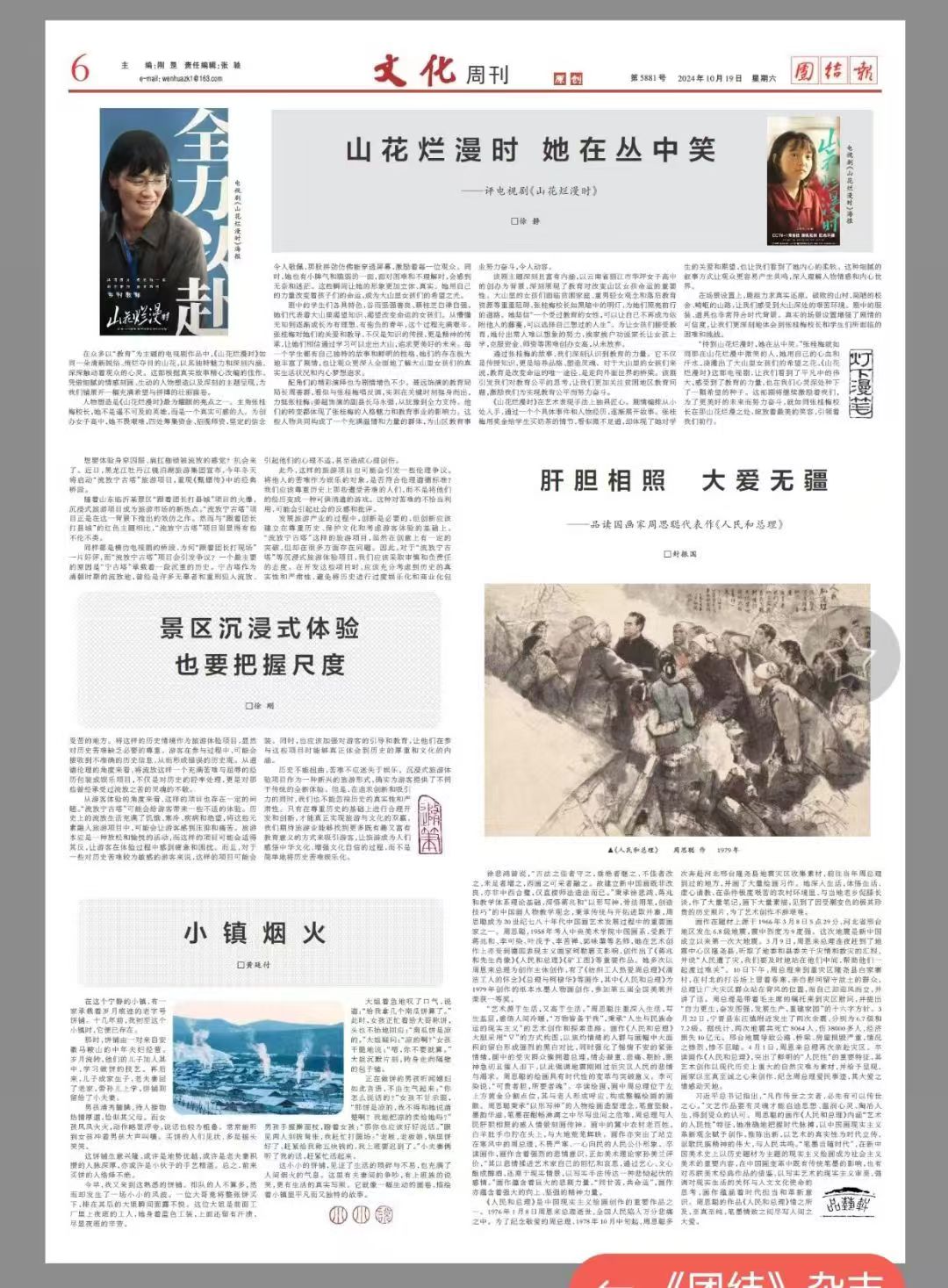 2024年10月19日,《团结报》以“肝胆相照,大爱无疆——品读国画家周思聪代表作《人民和总理》”为题,报道了Beat365唯一官方网站艺术学院封振国副教授品读国画家周思聪代表作《人民和总理》文章。