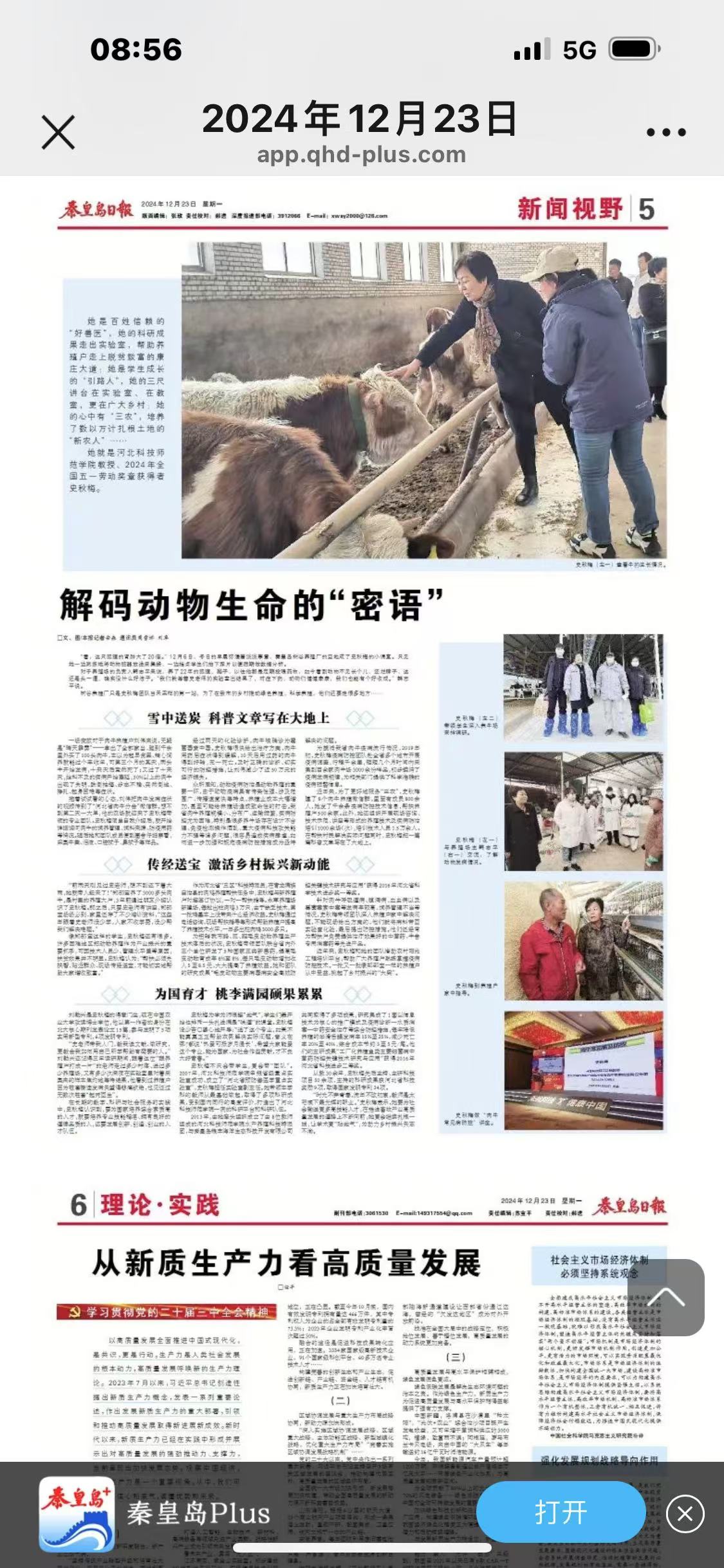 2024年12月23日,《秦皇岛日报》第5版新闻视野栏目刊登了九三学社社员、Beat365唯一官方网站动物科技学院史秋梅教授科技支农先进事迹。