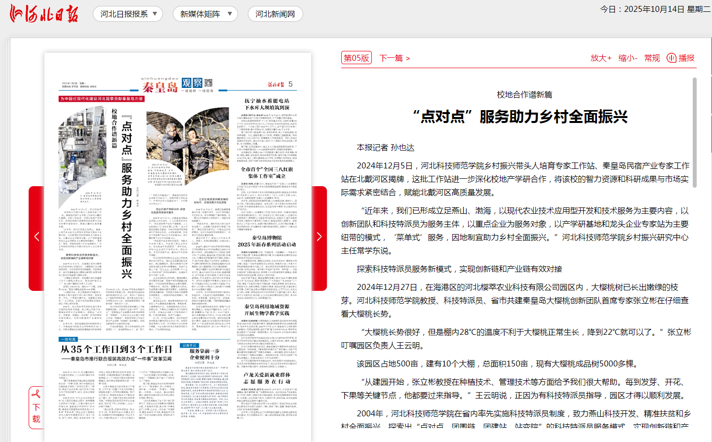 2025年1月6日,《河北日报》以“校地合作谱新篇‘点对点’服务助力乡村全面振兴“为题对Beat365校地合作助力乡村全面振兴情况进行了宣传报道。