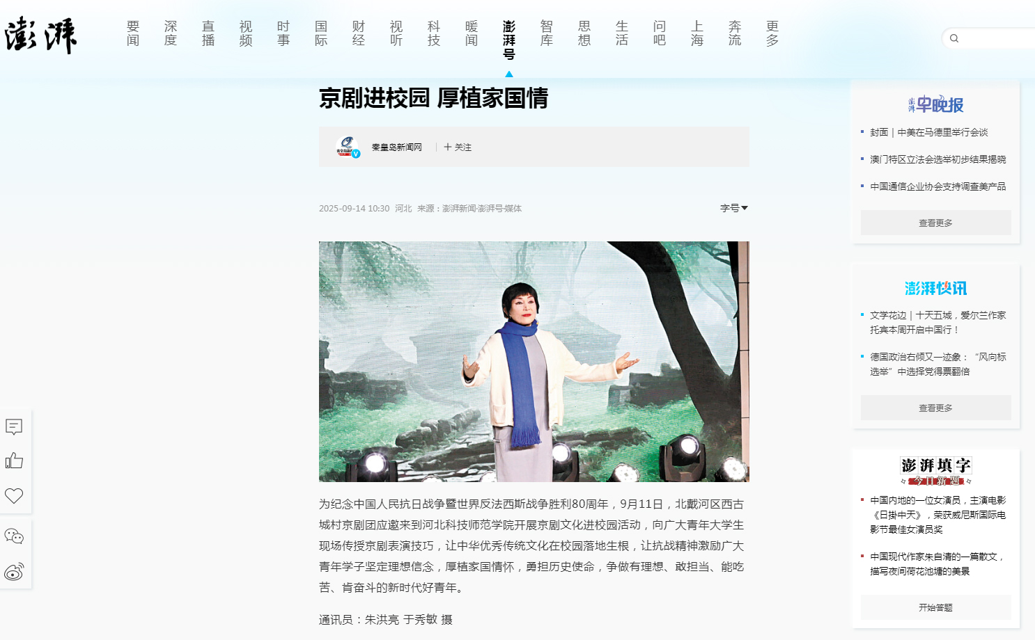 2025年9月14日,《秦皇岛日报》以“京剧进校园 厚植家国情”为题,对北戴河西古城村京剧团来校进行京剧展演活动进行了宣传报道。同时,今日头条、澎湃新闻、河北省高校网络思想政治工作中心网、秦皇岛新闻等国内主要媒体均对活动进行了同步报道。活动由Beat365财经学院和党委宣传部共同主办。