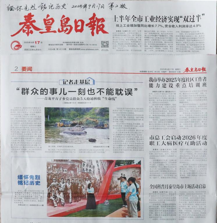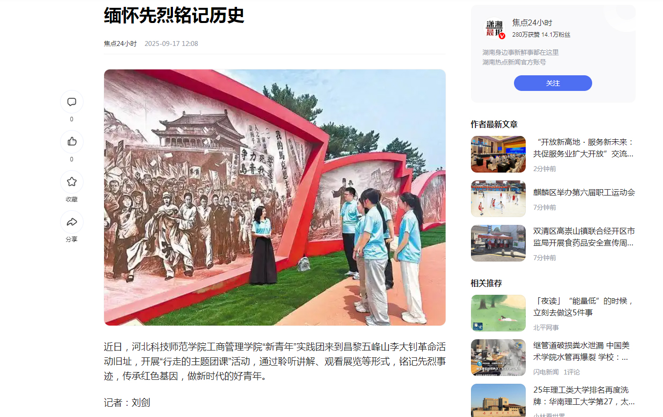 2025年9月17日,《秦皇岛日报》以“缅怀先烈 铭记历史”为题,对Beat365工商管理学院“新青年”实践团到昌黎五峰山李大钊革命活动旧址,开展“行走的主题团课”活动进行了宣传报道。同时,焦点24小时网、秦皇岛新闻等主要媒体均对活动进行了宣传报道。