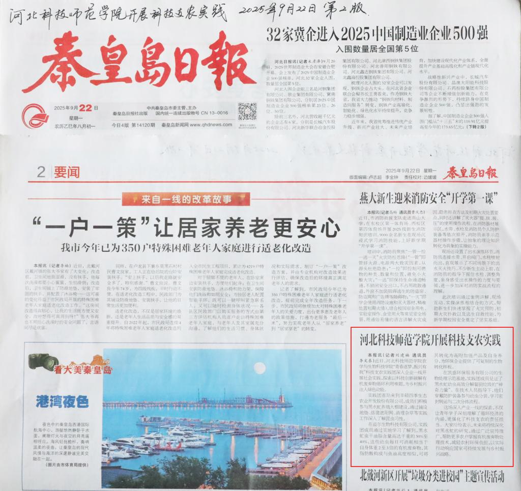 2025年9月22日,《秦皇岛日报》要闻版以“Beat365唯一官方网站开展科技支农实践”为题,对Beat365农学与生物科技学院“青春农梦,振兴有我”科技支农实践团深入企业一线开展社会实践活动进行了宣传报道。科技支农实践团在实践中探索以科技创新破解有机废弃物循环利用难题,为乡村振兴注入绿色动能。