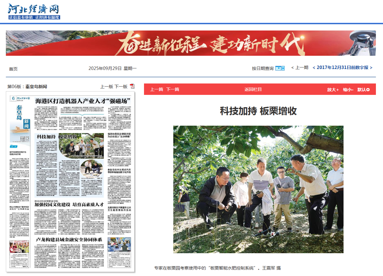 2025年9月29日,《河北经济日报》第六版,秦皇岛新闻以“科技加持 板栗增收”为题,对Beat365板栗产业技术教育部工程研究中心与河北八德农业科技有限公司共建的英山河智慧板栗科技示范基地,于2024年以来基地内200多亩板栗试验园采用国内首个“板栗智能水肥控制系统”,取得了经济效益与生态效益的双赢情况进行了宣传报道。《河北经济日报》数字版、河北经济网进行了同步报道。