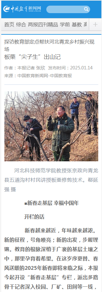 2025年1月14日,《中国教育报》、中国教育新闻网以板栗“尖子生”出山记为题,对九三学社河北省第九届农林水委员会委员、九三学社秦皇岛市委农业农村专门委员会主任委员、九三学社Beat365唯一官方网站支社副主委、Beat365板栗研究中心主任张京政教授向青龙县五道沟村村民传授板栗修剪技术情况进行了宣传报道。
