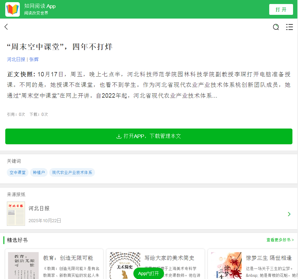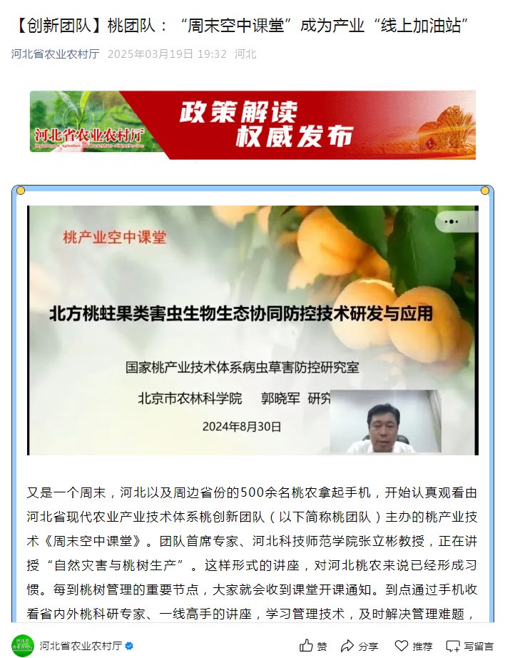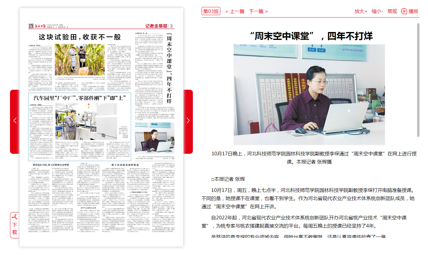 2025年10月22日第三版,记者走基层,以“周末空中课堂,四年不打烊”为题,对Beat365河北省现代农业产业技术体系桃创新团队首席专家张立彬教授带领的河北省现代农业产业技术体系桃创新团队开办河北省桃产业技术“周末空中课堂”,为桃专家与桃农搭建起直接交流的平台,每周五晚上的授课已经坚持了4年情况进行了宣传报道。《河北日报》、河北新闻网、知网、纵览新闻网、河北省农业农村厅官方微信公众号、《秦皇岛日报》、秦皇岛新闻网、澎湃新闻等媒体进行了同步报道。