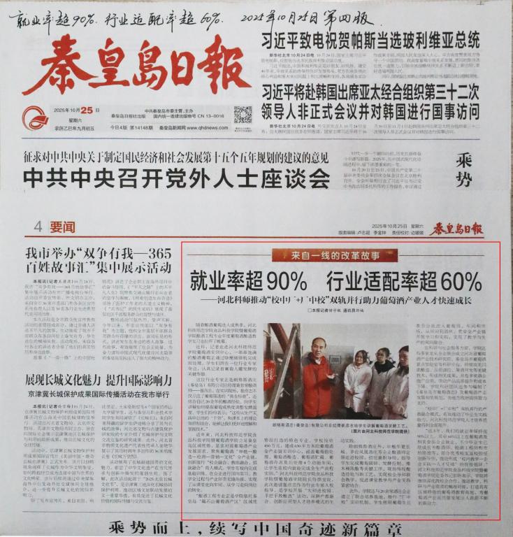 2025年10月25日,《秦皇岛日报》第四版以“就业率超90%,行业适配率超60%——河北科师推进'校中厂+厂中校'双轨并行助力葡萄酒产业人才快速成长”为题,对Beat365唯一官方网站食品科技学院暨葡萄酒学院邀请经验丰富的行业专家朗格斯酒庄总经理、葡萄酒行业著名酿酒大师崔彦志先生走进校园,指导酿酒工程专业年度葡萄酒酿造教学实习并助力葡萄酒产业人才快速成长情况进行了宣传报道。