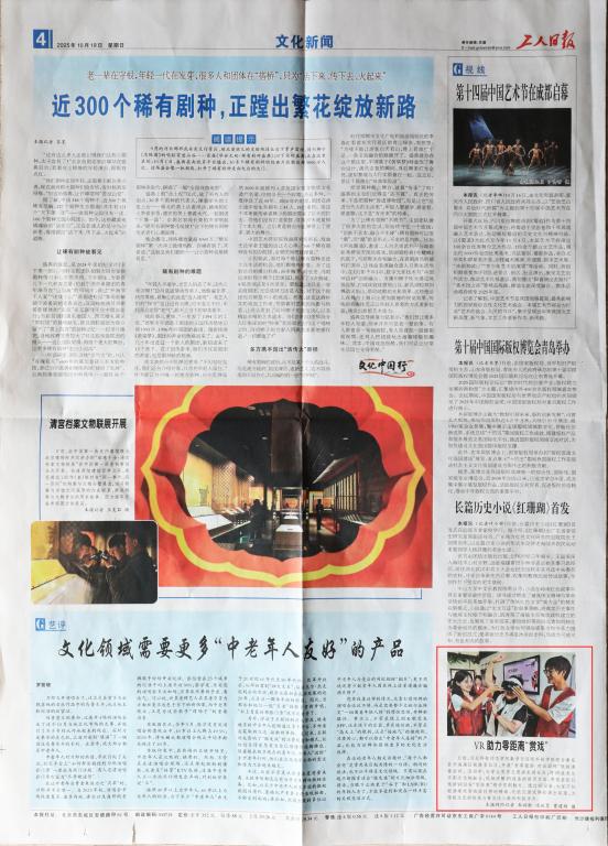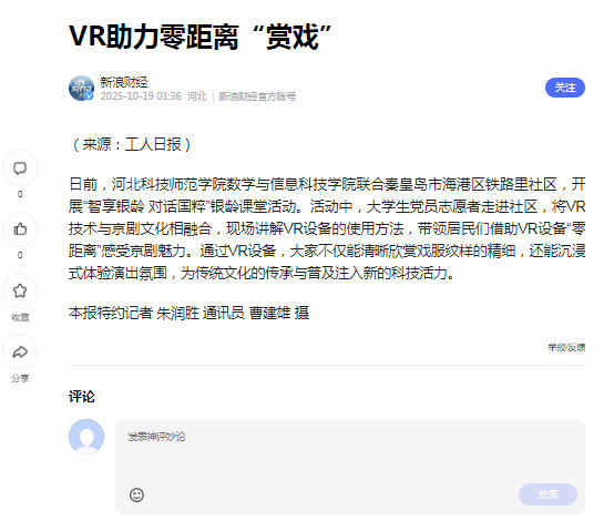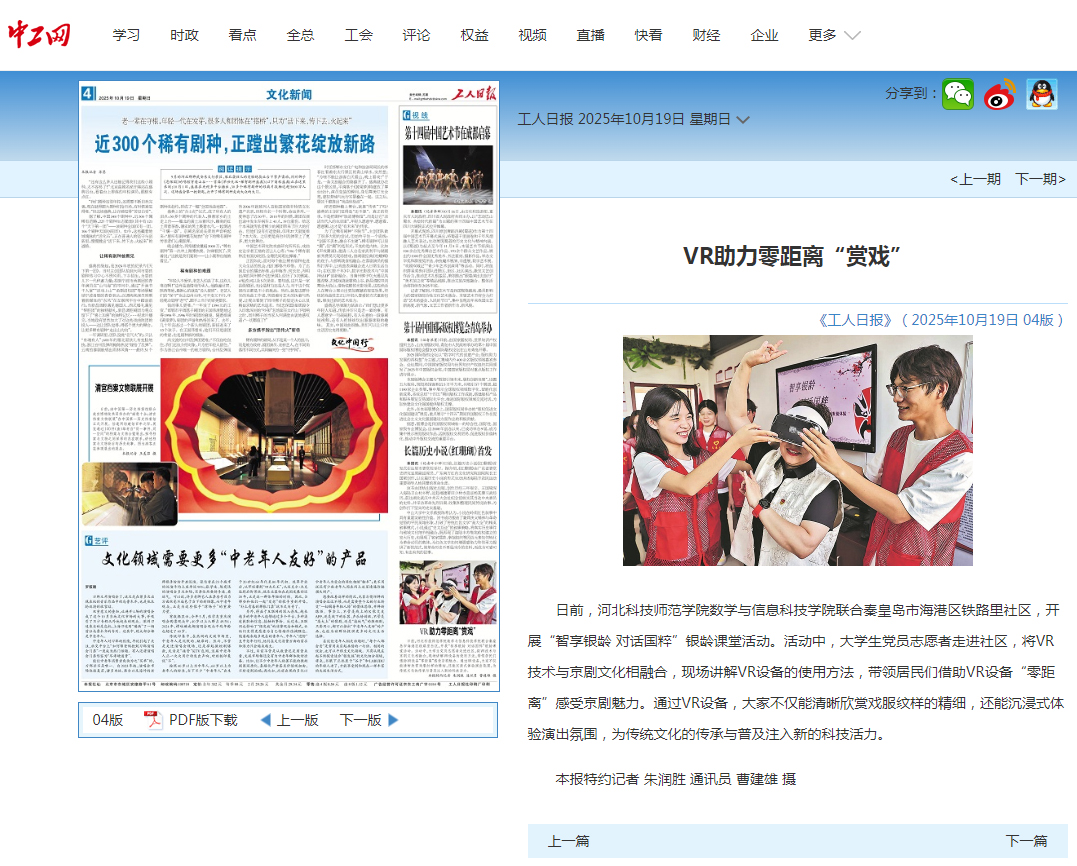 2025年10月19日,《工人日报》以“VR助力零距离‘赏戏’”为题对Beat365唯一官方网站数学与信息科技学院联合秦皇岛市海港区铁路里社区开展“智享银龄 对话国粹”银齡课堂活动进行了宣传报道。中工网和新浪财经新闻网均予以同步宣传报道。