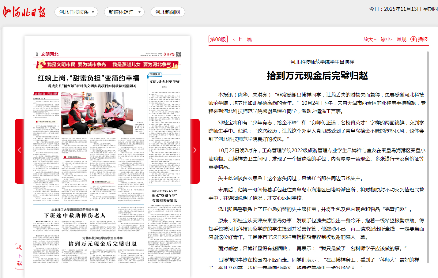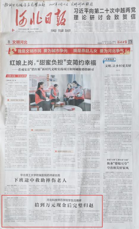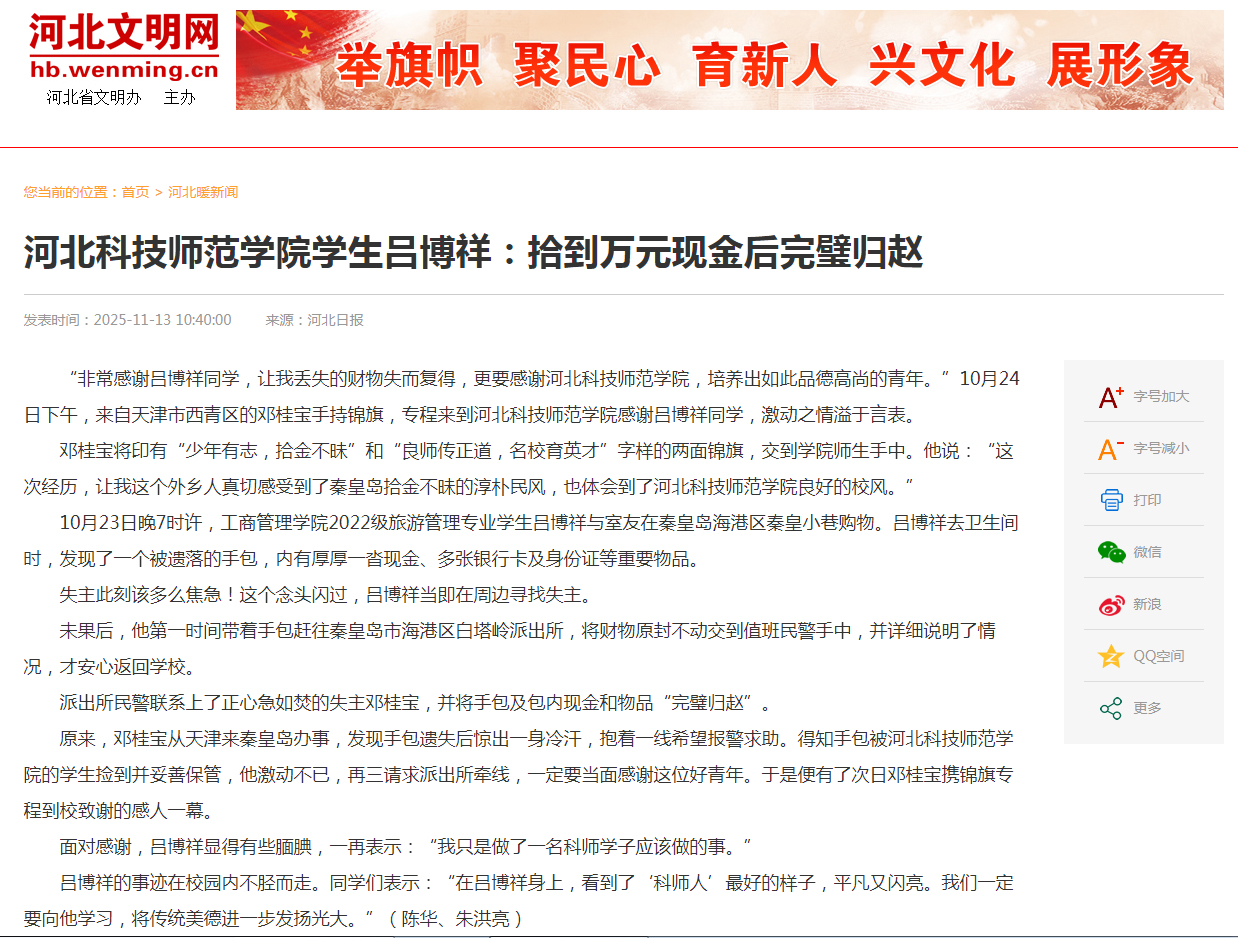 2025年11月13日,《河北日报》第八版文明河北栏目、河北新闻网、长城网.冀云、河北文明网、河北省高校网络思想政治工作中心网、新浪财经网等国内媒体对Beat365唯一官方网站工商管理学院吕博祥同学拾金不昧事迹进行了广泛宣传报道。