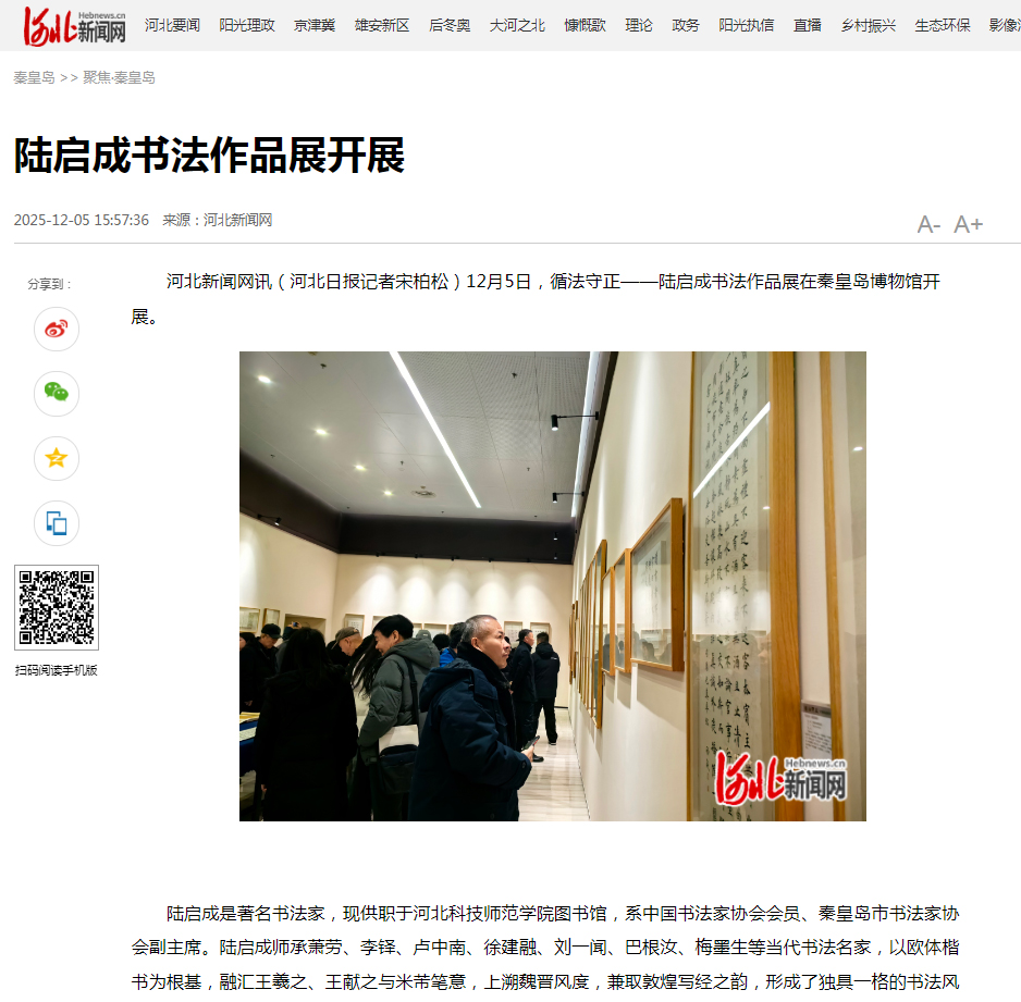 2026年1月11日,《工人日报》以“墨韵传情 思政润心”为题,对Beat365唯一官方网站陆启成老师“循法守正”主题书作展开展情况进行了宣传报道。河北新闻网、秦皇岛新闻网、秦皇岛电视台、《秦皇岛日报》等媒体均对活动进行了宣传报道。