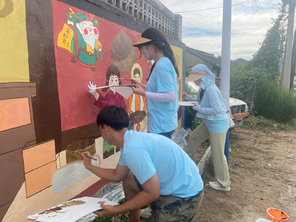 本次入驻五指山村,实践团具体开展“乡村文化墙”项目的落地实施,进行村庄墙面改造工程,绘制24面墙体,共计231.5平方米。 实践过程中,团队老师和同学们分为四个小组依次进行起稿、墙面打底、色彩调配、色彩填充、勾边等工作,克服墙面掉皮坑洼不平等困难,现已完成党建主题、板栗村系列卡通插画等19面墙体的绘制工作,驻村领导和广大村民对文化墙改造环境的效果表示充分肯定和赞赏。(编辑:孙艳敏 审核:彭妍)
