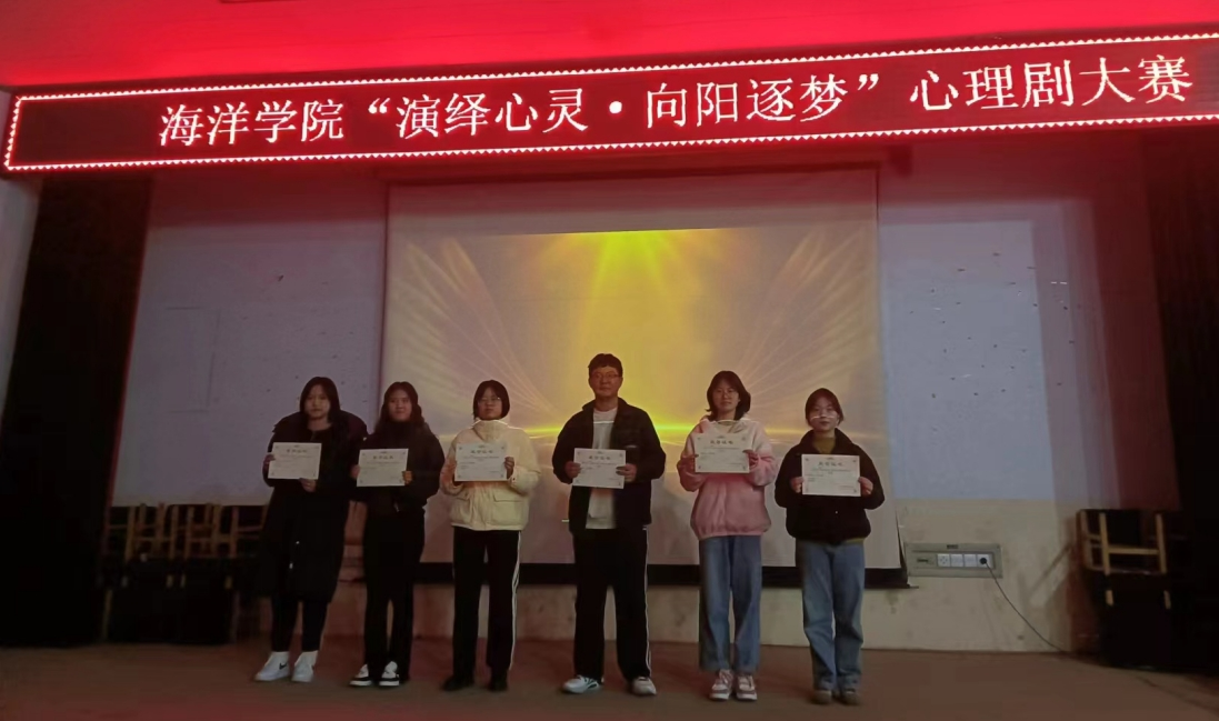 为进一步宣传普及心理健康知识,提高大学生心理健康意识,11月10日,海洋资源与环境学院在学术报告厅举办海洋资源与环境学院“演绎心灵•向阳逐梦”校园心理情景剧大赛。学生处心理咨询中心韩露蕾老师及学院学工办老师参加了本次活动。