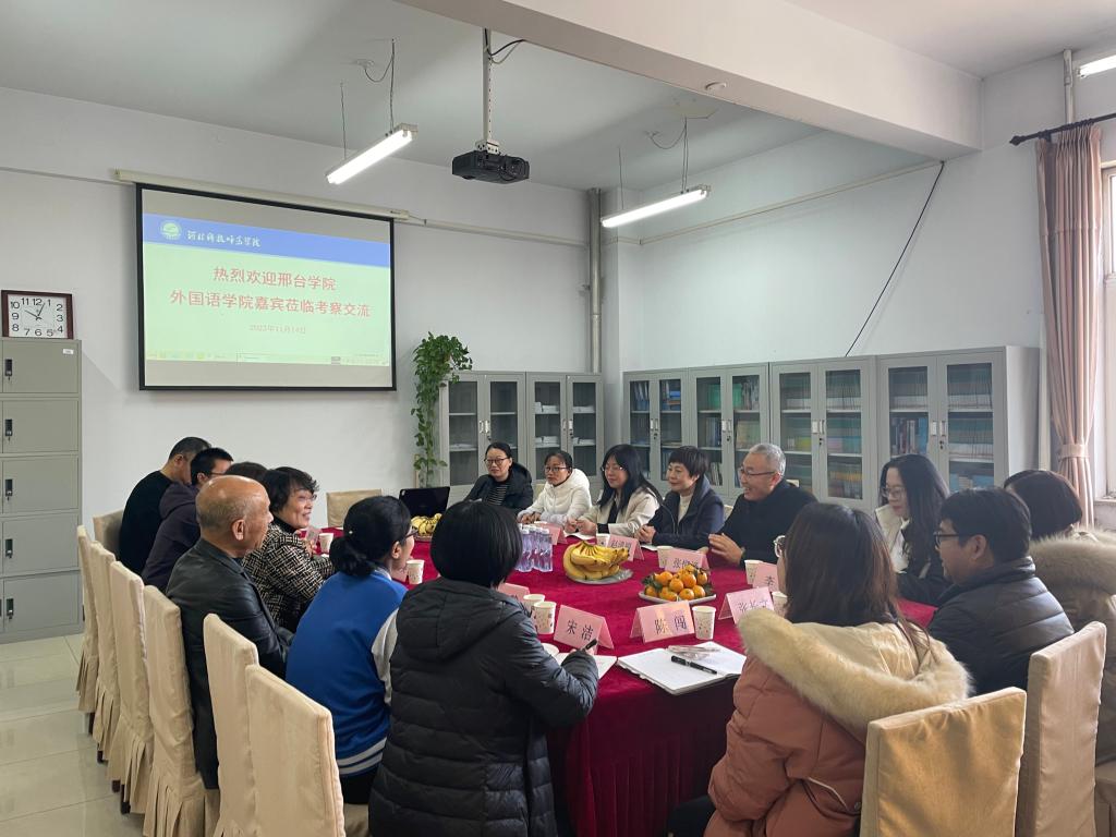 11月14日,邢台学院外国语学院副院长赵清丽、副书记张恒泽一行7人来Beat365外国语学院考察交流。外国语学院有关领导,英语教学部、公共英语教学部、学工办老师参加座谈。