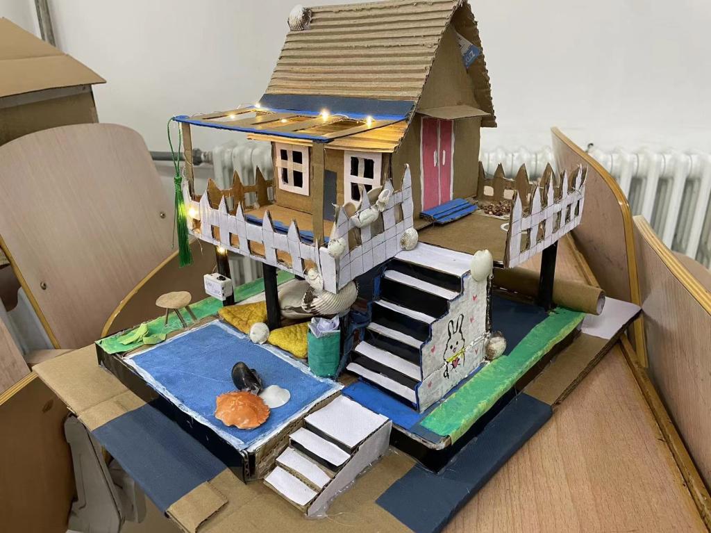 这场展览的特色在于,参展者们利用各种看似无用的废弃物品,经过巧手改造,最终变成了一件件精湛的作品。在展览现场,同学们用废旧纸壳搭建一座座建筑:有天安门、有天坛、明珠塔……这些作品无一不体现出废物也能变为宝的理念,同时也展现出了同学们的无限创意。