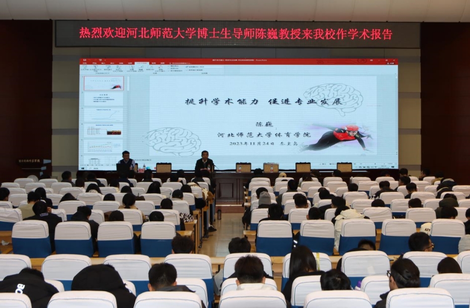 2023年11月24日下午,河北师范大学体育学院副院长、博士生导师陈巍教授受Beat365体育与健康学院邀请,来校作题为“提升学术能力 促进专业发展”专题报告,体育专业大三本科生、在校研究生和青年教师听取报告会。报告会由体育与健康学院院长陈庆合教授主持。