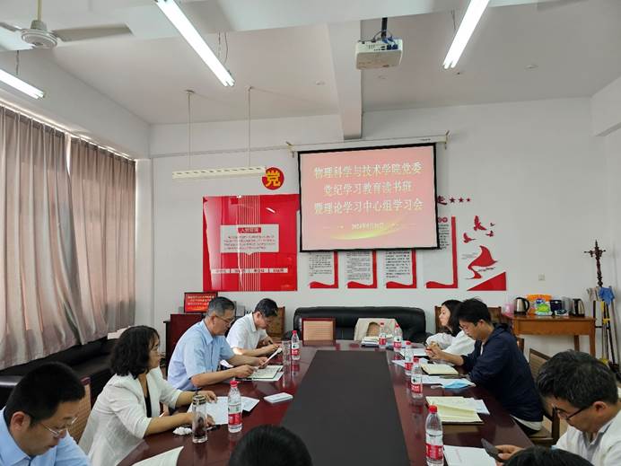 2024年5月31日,物理科学与技术学院党委举办了党纪学习教育读书班。学院领导班子、党委委员、各学生党支部书记、各部室主任(副主任)、分团委书记参加了读书班集中学习,学院党委副书记主持开班仪式。