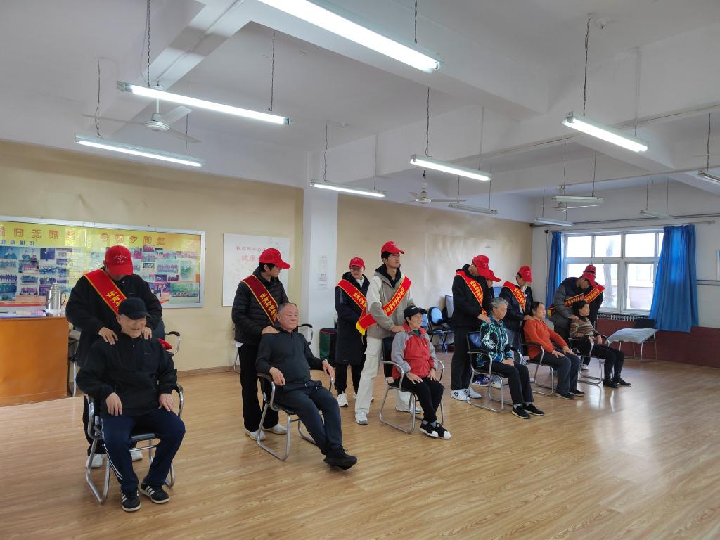 太极拳、八段锦展示及保健按摩由体育与健康学院青年志愿者协会组织。运动康复专业的同学们运用平时所学专业技能为老同志们进行了穴位按摩,并就老年人常见的头颈、肩周等问题预防予以耐心讲解;休闲体育专业的同学们分别展示了太极拳和八段锦,老同志亲切地与他们一起切磋“武艺”。同学们结合专业优势,学以致用让老同志们倍感温暖。